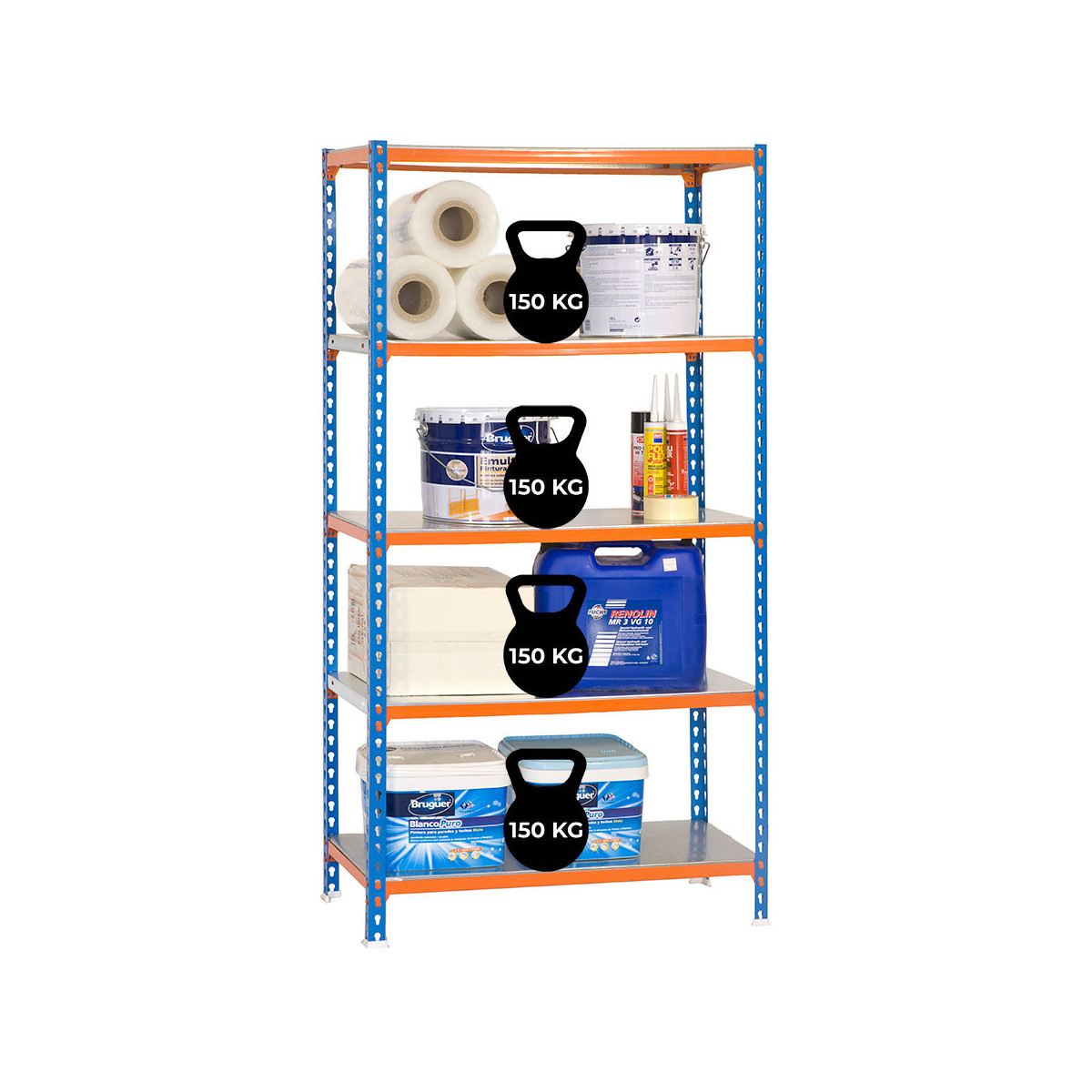 Estantería metálica sin tornillos de color AZUL/NARANJA/MADERA con capacidad de carga por estante de 150 kg.El número de estantes es 5 y las medidas (alto x ancho x fondo) son 1800x900x400 mm.Tiene estantes de aglomerado de 12 mm.Producto español de calidad europea.Medidas en uso del producto: 1787x877x410 mm